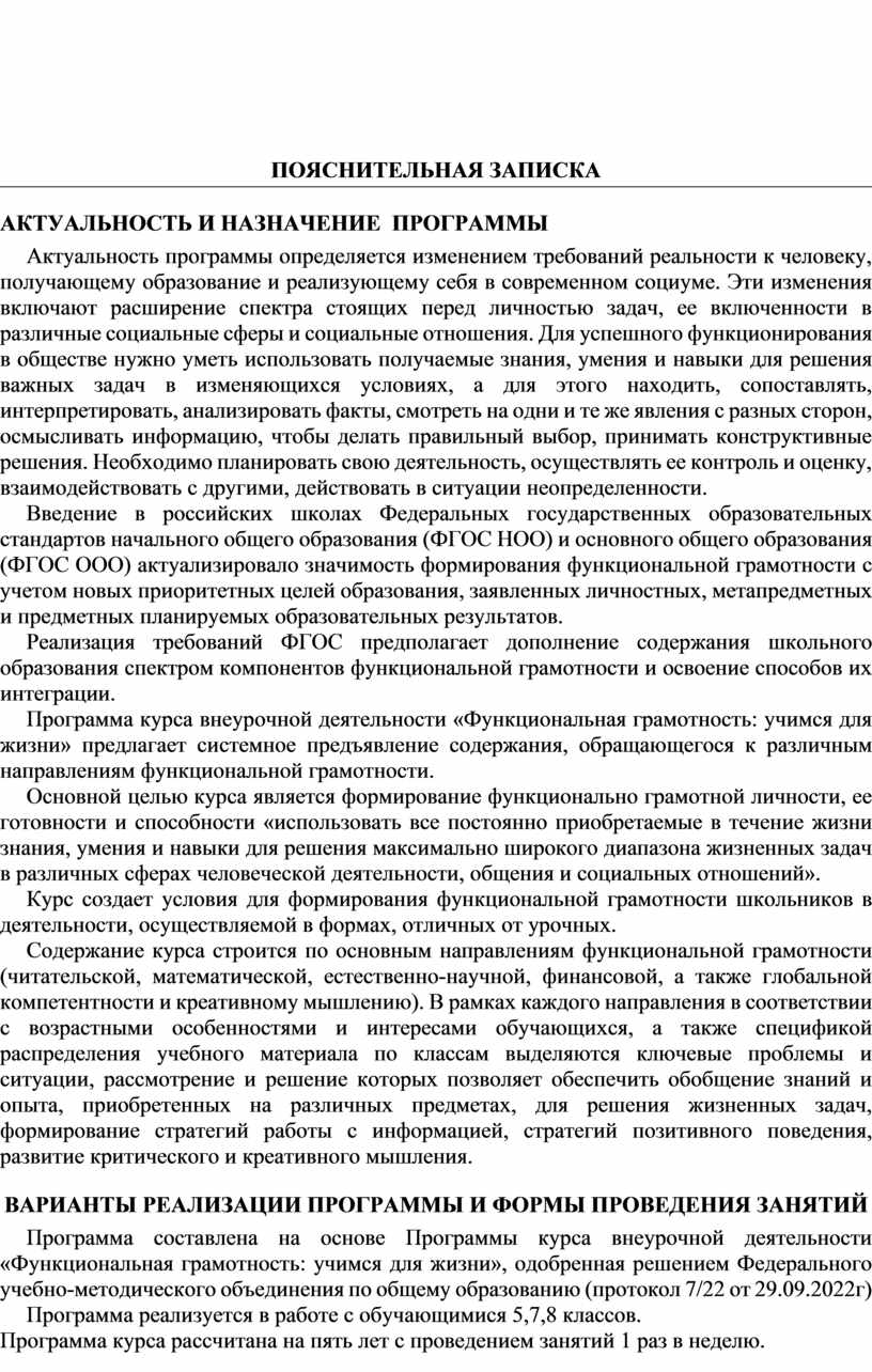 Программа составлена на основе Программы курса внеурочной деятельности «Функциональная грамотность: учимся для жизни», одобренная решением Федерального учебно-методического объединения по общему образованию (протокол 7/22 от 29.09.2022г)