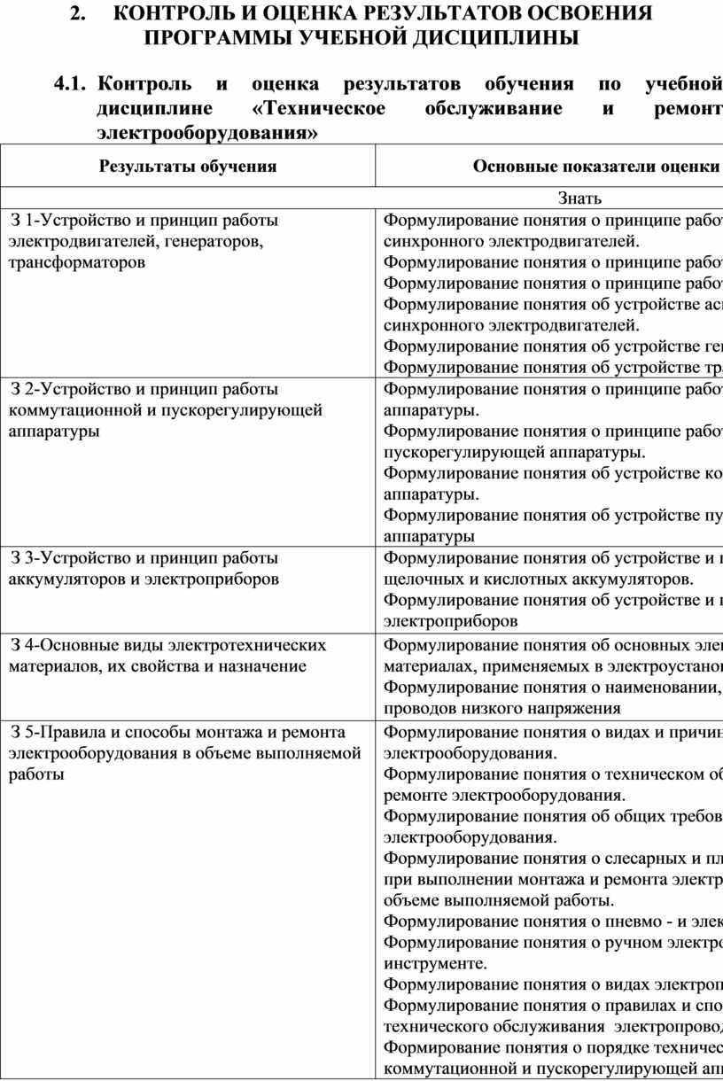 4.1. Контроль и оценка результатов обучения по учебной дисциплине «Техническое обслуживание и ремонт электрооборудования»