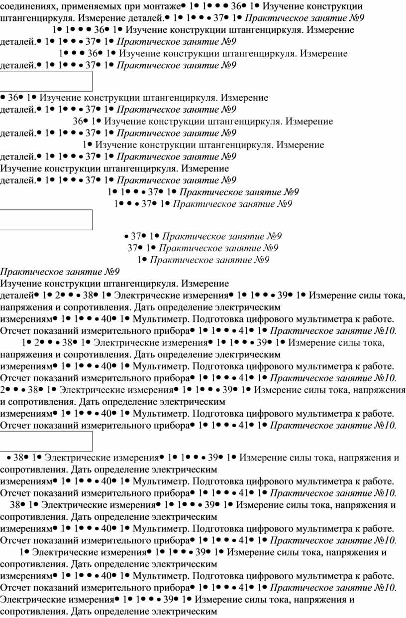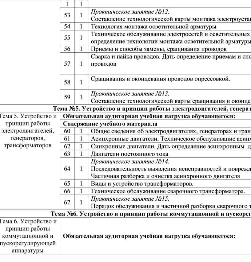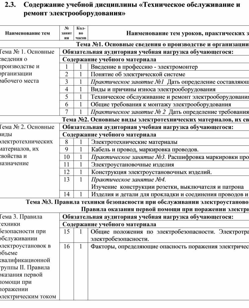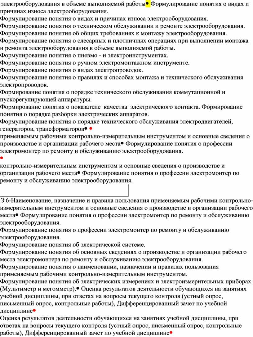 Формулирование понятия о видах и причинах износа электрооборудования. Формулирование понятия о техническом обслуживании и ремонте электрооборудования. Формулирование понятия об общих требованиях к монтажу электрооборудования. Формулирование понятия о слесарных и плотничных операциях при выполнении монтажа и ремонта электрооборудования в объеме выполняемой работы. Формулирование понятия о пневмо - и электроинструментах. Формулирование понятия о ручном электромонтажном инструменте. Формулирование понятия о видах электропроводок. Формулирование понятия о правилах и способах монтажа и технического обслуживания электропроводок. Формирование понятия о порядке технического обслуживания коммутационной и пускорегулирующей аппаратуры. Формирование понятия о показателе качества электрического контакта. Формирование понятия о порядке разборки электрических аппаратов. Формулирование понятия о порядке технического обслуживания электродвигателей, генераторов, трансформаторов |