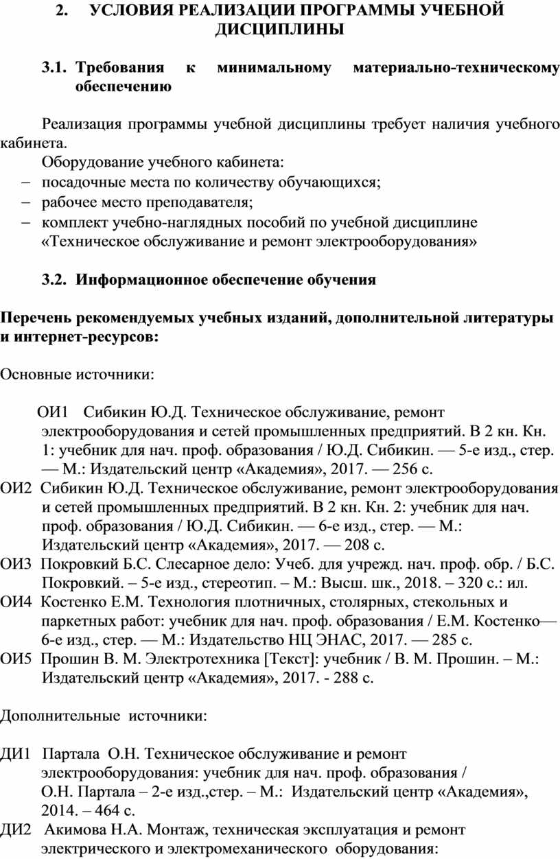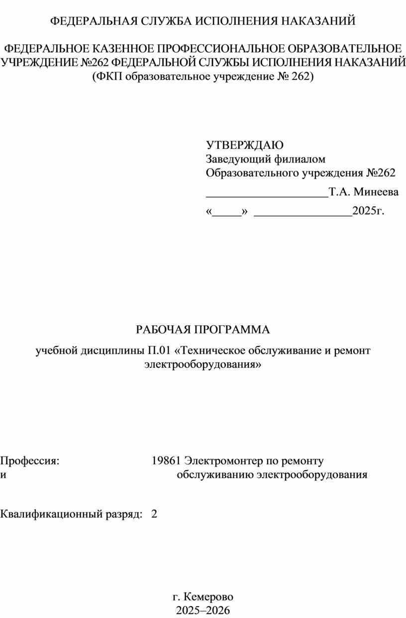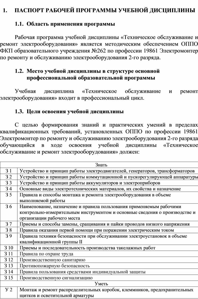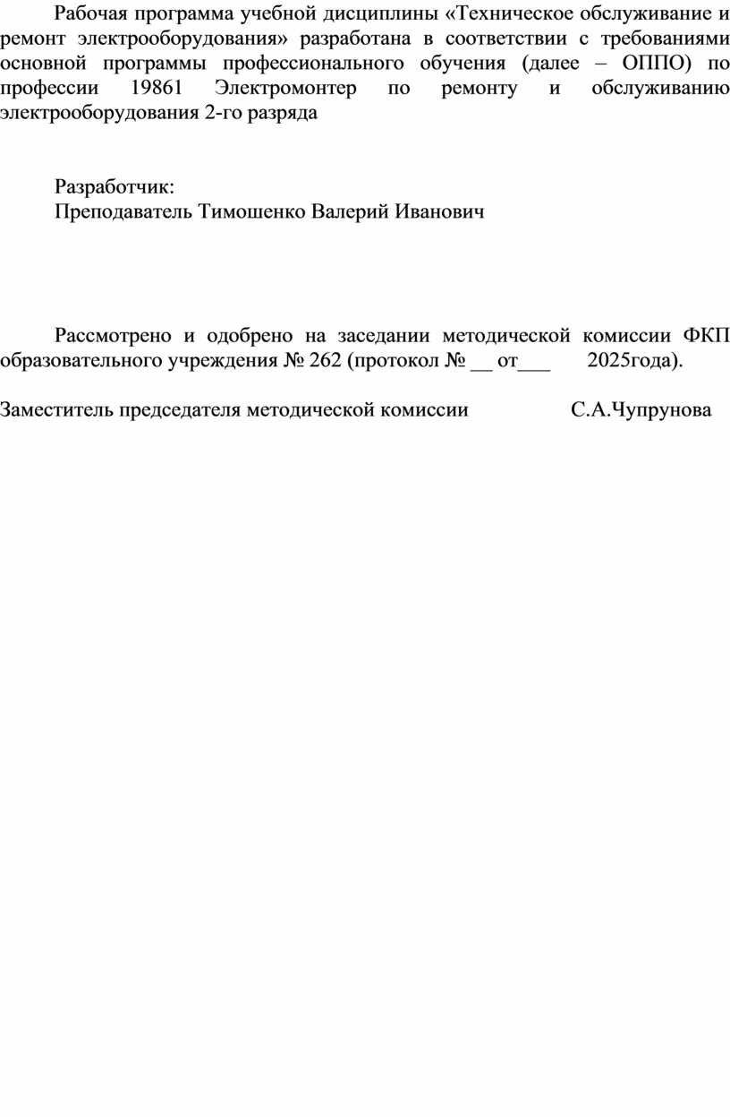 Рабочая программа учебной дисциплины «Техническое обслуживание и ремонт электрооборудования» является методическим обеспечением ОППО ФКП образовательного учреждения №262 по профессии 19861 Электромонтер по ремонту и обслуживанию электрооборудования 2-го разряда.