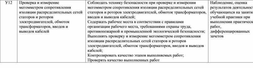 Соблюдать технику безопасности при проверке и измерении мегомметром сопротивления изоляции распределительных сетей статоров и роторов электродвигателей, обмоток трансформаторов, вводов и выводов кабелей; Содержать рабочее места в соответствии с правилами организации рабочего места, требованиями охраны труда, противопожарной и промышленной экологической безопасности; Выполнять проверку и измерение мегомметром сопротивления изоляции распределительных сетей статоров и роторов электродвигателей, обмоток трансформаторов, вводов и выводов кабелей; Контролировать качество этапов выполняемых работ; Проверять качество выполненных работ |