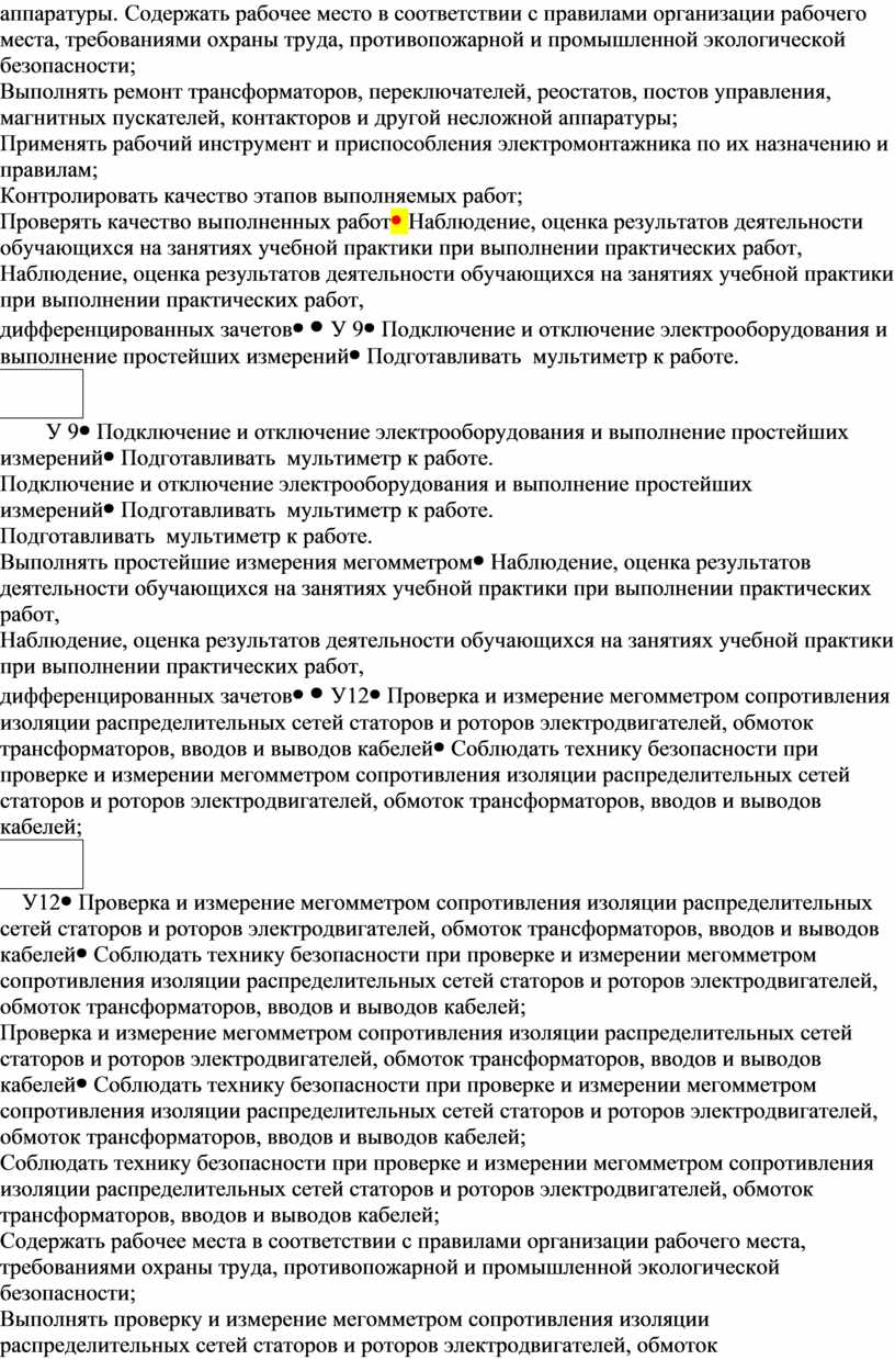 Соблюдать технику безопасности при выполнении ремонта трансформаторов, переключателей, реостатов, постов управления, магнитных пускателей, контакторов и другой несложной аппаратуры. Содержать рабочее место в соответствии с правилами организации рабочего места, требованиями охраны труда, противопожарной и промышленной экологической безопасности; Выполнять ремонт трансформаторов, переключателей, реостатов, постов управления, магнитных пускателей, контакторов и другой несложной аппаратуры; Применять рабочий инструмент и приспособления электромонтажника по их назначению и правилам; Контролировать качество этапов выполняемых работ; Проверять качество выполненных работ |