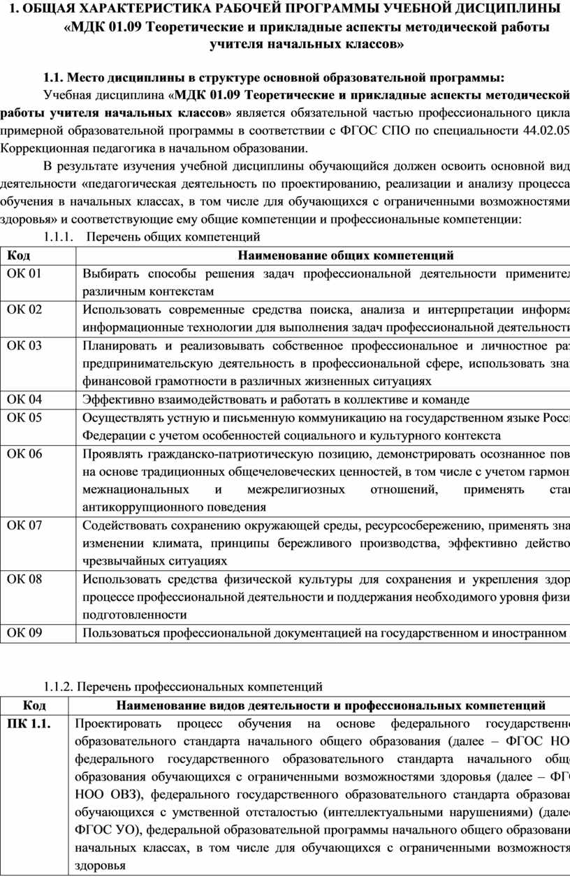 Учебная дисциплина «МДК 01.09 Теоретические и прикладные аспекты методической работы учителя начальных классов» является обязательной частью профессионального цикла примерной образовательной программы в соответствии с ФГОС СПО по специальности 44.02.05 Коррекционная педагогика в начальном образовании.