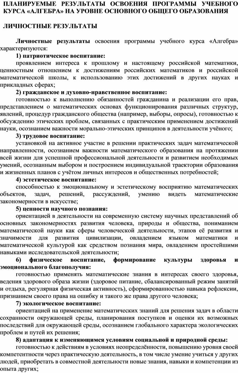 ПЛАНИРУЕМЫЕ РЕЗУЛЬТАТЫ ОСВОЕНИЯ ПРОГРАММЫ УЧЕБНОГО КУРСА «АЛГЕБРА» НА УРОВНЕ ОСНОВНОГО ОБЩЕГО ОБРАЗОВАНИЯ