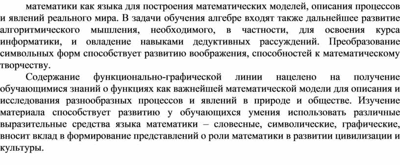 Содержание двух алгебраических линий – «Алгебраические выражения» и «Уравнения и неравенства» способствует формированию у обучающихся математического аппарата, необходимого для решения задач математики, смежных предметов и практико-ориентированных задач. На уровне основного общего образования учебный материал группируется вокруг рациональных выражений. Алгебра демонстрирует значение математики как языка для построения математических моделей, описания процессов и явлений реального мира. В задачи обучения алгебре входят также дальнейшее развитие алгоритмического мышления, необходимого, в частности, для освоения курса информатики, и овладение навыками дедуктивных рассуждений. Преобразование символьных форм способствует развитию воображения, способностей к математическому творчеству.