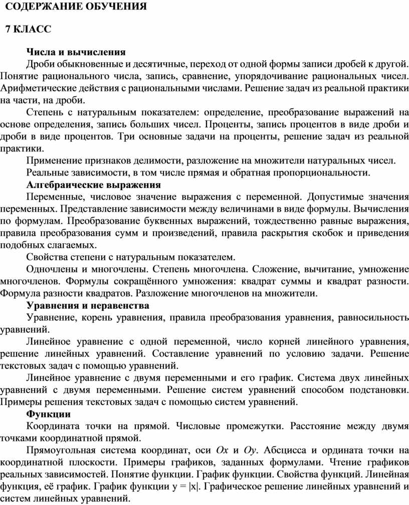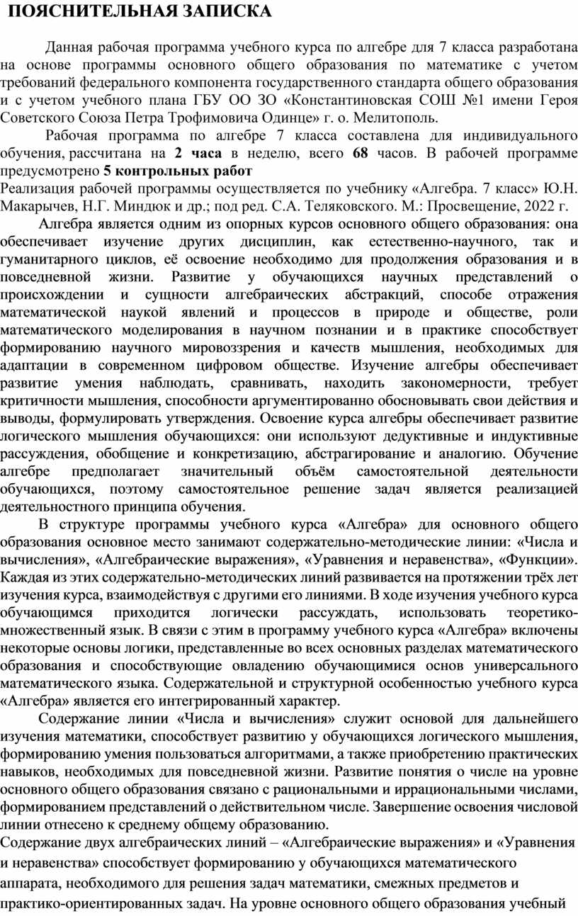 Данная рабочая программа учебного курса по алгебре для 7 класса разработана на основе программы основного общего образования по математике с учетом требований федерального компонента государственного стандарта общего образования и с учетом учебного плана ГБУ ОО ЗО «Константиновская СОШ №1 имени Героя Советского Союза Петра Трофимовича Одинце» г. о. Мелитополь.