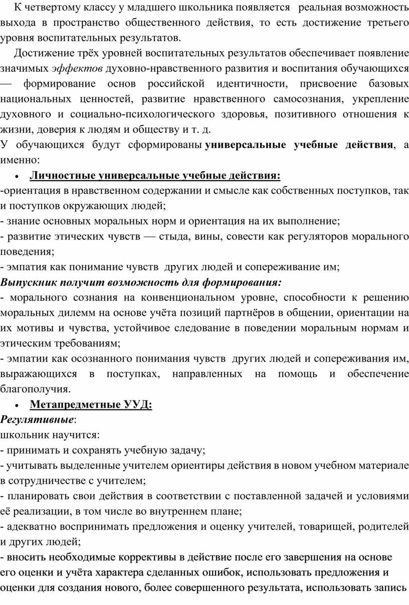 получение обучающимся начального опыта самостоятельного общественного действия, формирование у младшего школьника социально приемлемых моделей поведения. Только в самостоятельном общественном действии человек действительно становится гражданином, социальным деятелем, свободным человеком. Для достижения данного уровня результатов особое значение имеет взаимодействие обучающегося с представителями различных социальных субъектов за пределами образовательного учреждения, в открытой общественной среде. (создаются необходимые условия для участия обучающихся в нравственно ориентированной социально значимой деятельности и приобретения ими элементов опыта нравственного поведения и жизни) |