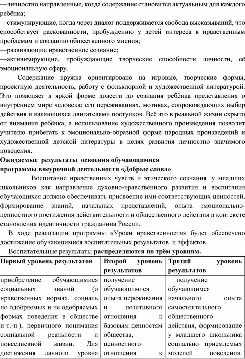 Нравственное развитие личности учащегося как приоритетная цель начальной школы предполагает организацию нравственного образования младших школьников как в процессе изучения учебных предметов («Литературное чтение», «Окружающий мир», «Основы духовно-нравственной культуры народов России»), так и во внеурочной деятельности в форме кружка «Добрые слова»