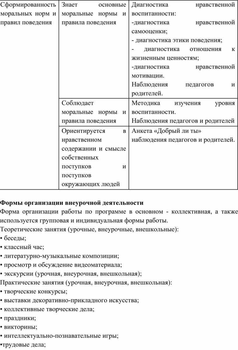 Диагностика нравственной воспитанности: -диагностика нравственной самооценки; - диагностика этики поведения; - диагностика отношения к жизненным ценностям; -диагностика нравственной мотивации. Наблюдения педагогов и родителей. |