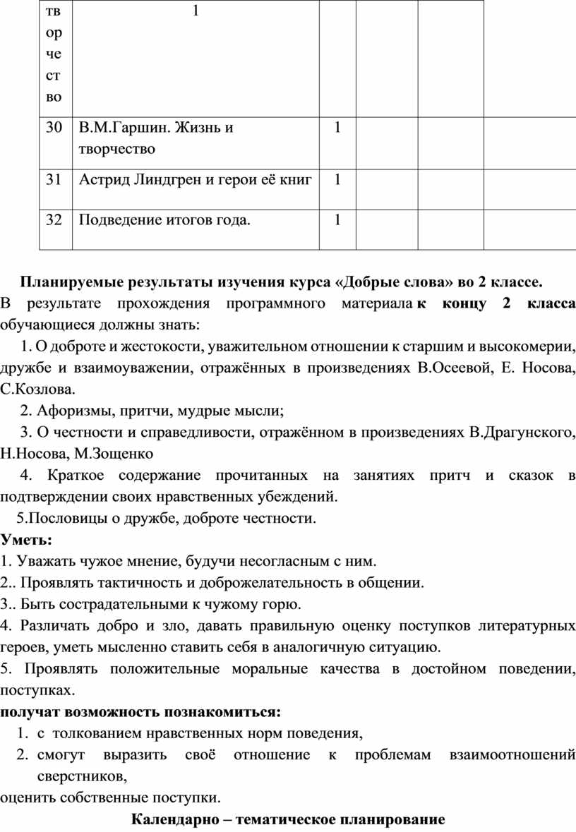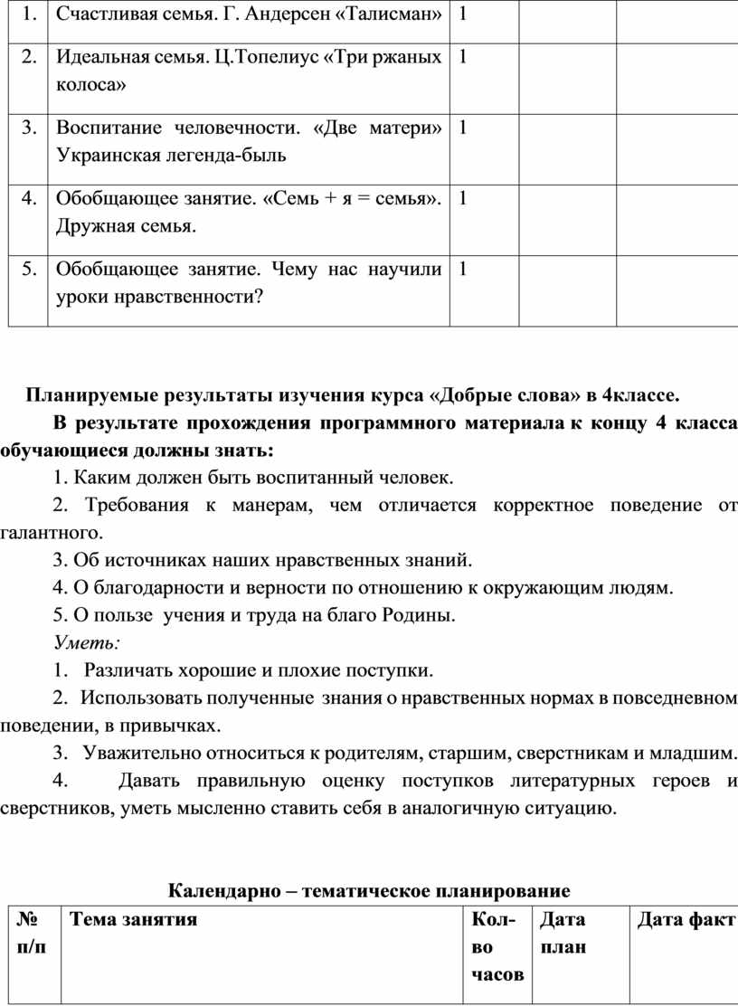 Планируемые результаты изучения курса «Добрые слова» в 4классе.