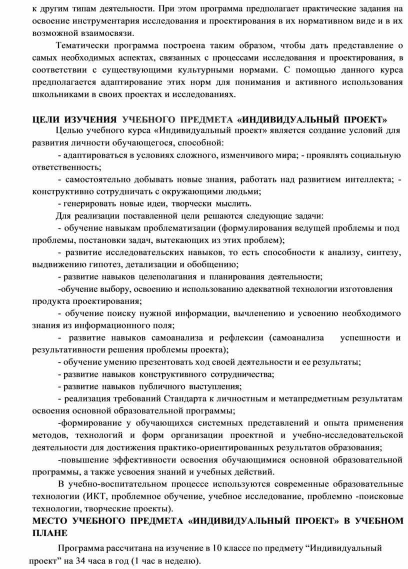 Индивидуальный проект представляет собой особую форму организации деятельности обучающихся (учебное исследование или учебный проект). Индивидуальный проект выполняется обучающимся самостоятельно под руководством учителя (тьютора) по выбранной теме в рамках одного или нескольких изучаемых учебных предметов, курсов в любой избранной области деятельности (познавательной, практической, учебно-исследовательской, социальной, художественно-творческой и др.). Индивидуальный проект выполняется обучающимся в течение одного года в рамках учебного времени, специально отведённого учебным планом, и должен быть представлен в виде завершённого учебного исследования или разработанного проекта: информационного, творческого, социального, прикладного, инновационного, конструкторского, инженерного.