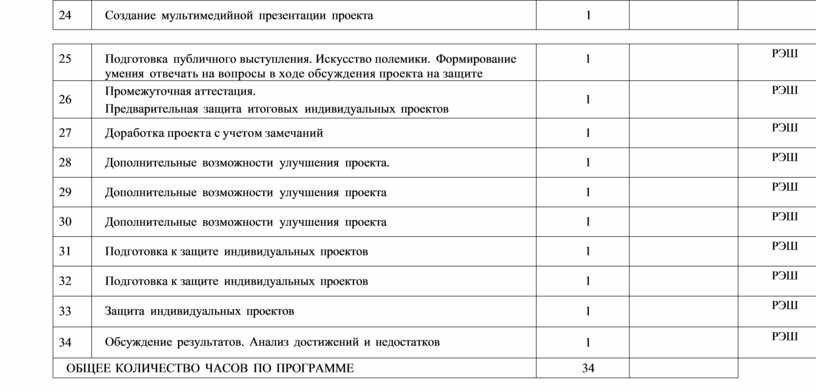 Требования к презентации: композиционная, содержательная, информационная стороны презентации. Создание мультимедийной презентации проекта: оформление (стиль, фон, цвет, анимация); информация на слайдах ( содержание и размещение информации на слайдах). Публичное выступление. Как знаменитые люди готовились к выступлениям. Коммуникативные барьеры. Отработка навыков монологической речи как один из главных предпосылок успеха публичного выступления. Упражнения на улучшение дикции. Основы ораторского искусства. Приемы удержания внимания аудитории. Приемы невербального общения с аудиторией. Подготовка авторского доклада. Главные предпосылки успеха публичного выступления. Искусство полемики. Искусство отвечать. Формирование умения отвечать на вопросы в ходе обсуждения проекта на защите. Предварительная защита итоговых индивидуальных проектов. Доработка презентационного материала с учетом замечаний. Защита итоговых индивидуальных проектов. Рефлексия. Обсуждение результатов, работа в группах сотрудничества. Анализ достижений и недостатков. Дополнительные возможности улучшения проекта.
