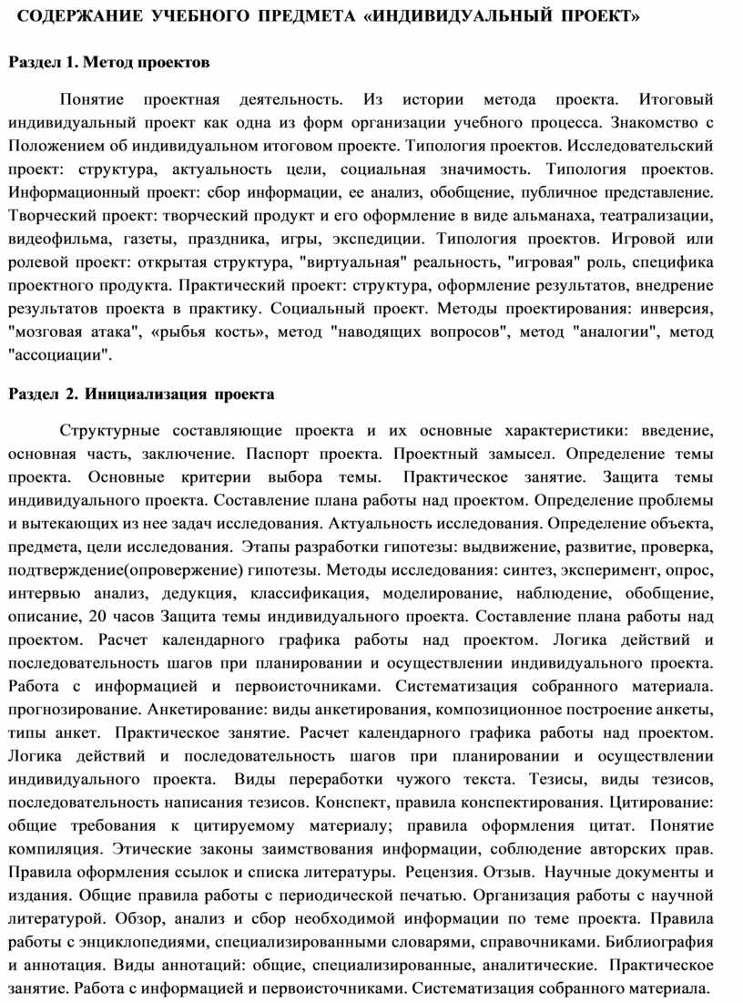 Структурные составляющие проекта и их основные характеристики: введение, основная часть, заключение. Паспорт проекта. Проектный замысел. Определение темы проекта. Основные критерии выбора темы. Практическое занятие. Защита темы индивидуального проекта. Составление плана работы над проектом. Определение проблемы и вытекающих из нее задач исследования. Актуальность исследования. Определение объекта, предмета, цели исследования. Этапы разработки гипотезы: выдвижение, развитие, проверка, подтверждение(опровержение) гипотезы. Методы исследования: синтез, эксперимент, опрос, интервью анализ, дедукция, классификация, моделирование, наблюдение, обобщение, описание, 20 часов Защита темы индивидуального проекта. Составление плана работы над проектом. Расчет календарного графика работы над проектом. Логика действий и последовательность шагов при планировании и осуществлении индивидуального проекта. Работа с информацией и первоисточниками. Систематизация собранного материала. прогнозирование. Анкетирование: виды анкетирования, композиционное построение анкеты, типы анкет. Практическое занятие. Расчет календарного графика работы над проектом. Логика действий и последовательность шагов при планировании и осуществлении индивидуального проекта. Виды переработки чужого текста. Тезисы, виды тезисов, последовательность написания тезисов. Конспект, правила конспектирования. Цитирование: общие требования к цитируемому материалу; правила оформления цитат. Понятие компиляция. Этические законы заимствования информации, соблюдение авторских прав. Правила оформления ссылок и списка литературы. Рецензия. Отзыв. Научные документы и издания. Общие правила работы с периодической печатью. Организация работы с научной литературой. Обзор, анализ и сбор необходимой информации по теме проекта. Правила работы с энциклопедиями, специализированными словарями, справочниками. Библиография и аннотация. Виды аннотаций: общие, специализированные, аналитические. Практическое занятие. Работа с информацией и первоисточниками. Систематизация собранного материала.