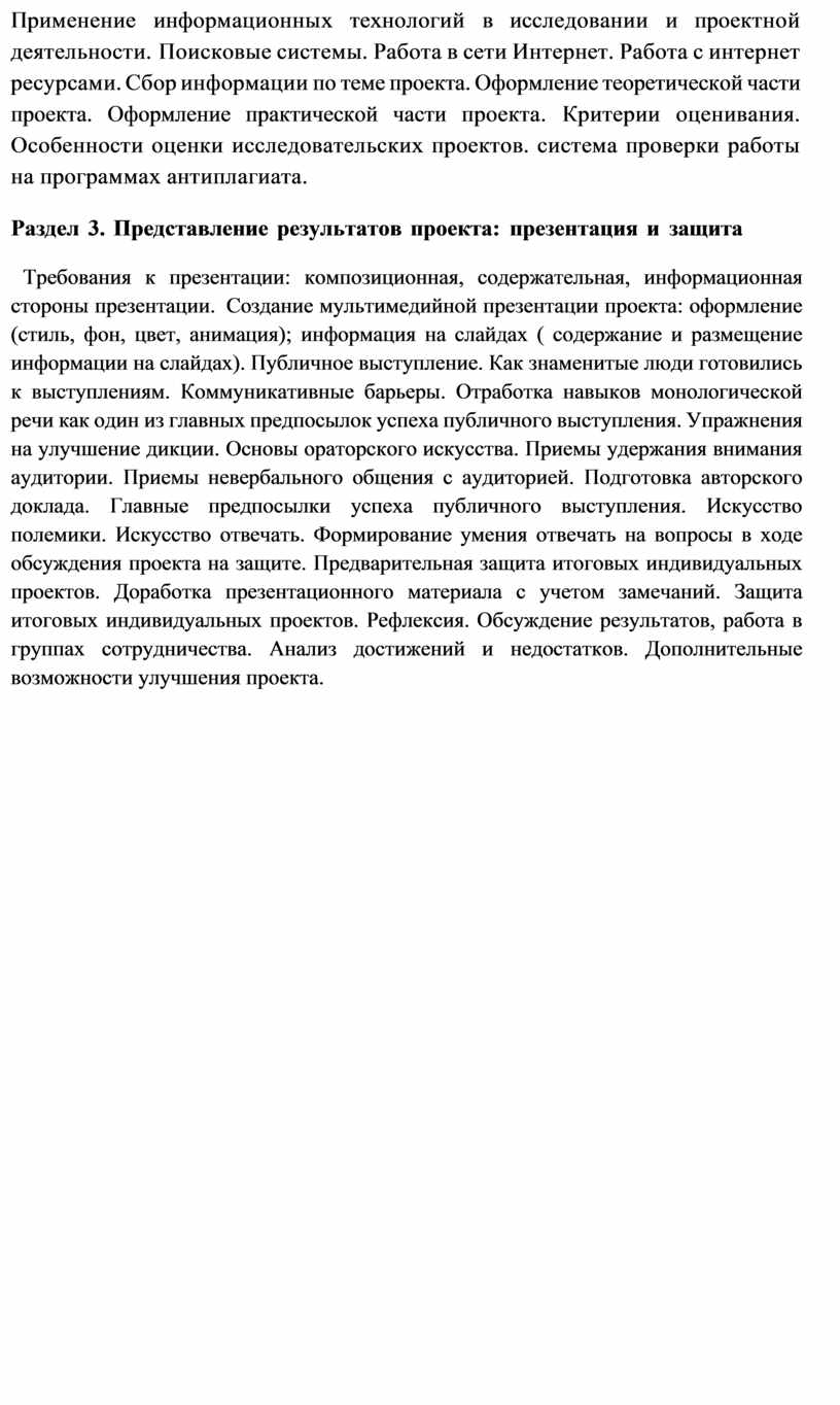 Применение информационных технологий в исследовании и проектной деятельности. Поисковые системы. Работа в сети Интернет. Работа с интернет ресурсами. Сбор информации по теме проекта. Оформление теоретической части проекта. Оформление практической части проекта. Критерии оценивания. Особенности оценки исследовательских проектов. система проверки работы на программах антиплагиата.