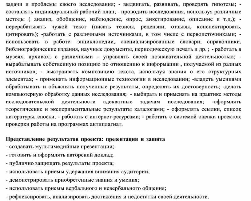 структурировать исследовательскую и проектную работы; - оформлять проектную работу; инициализировать и разрабатывать проект и проводить исследования; -формулировать тему, обосновывать ее актуальность; - выделять объект и предмет проектной работы: - определять задачи и проблемы своего исследования; - выдвигать, развивать, проверять гипотезы; - составлять индивидуальный рабочий план; - проводить исследования, используя различные методы ( анализ, обобщение, наблюдение, опрос, анкетирование, описание и т.д.); - перерабатывать чужой текст (писать тезисы, рецензии, отзывы, конспектировать, цитировать); -работать с различными источниками, в том числе с первоисточниками; - использовать в работе: энциклопедии, специализированные словари, справочники, библиографические издания, научные документы, периодическую печать и др. ; - работать в музеях, архивах; с различными - управлять своей познавательной деятельностью; - вырабатывать собственную позицию по отношению к информации , получаемой из разных источников; - выстраивать композицию текста, используя знания о его структурных элементах; - применять информационные технологии в исследовании; -владеть умениями обрабатывать и объяснять полученные результаты, определять их достоверность; -делать компьютерную обработку данных исследования; - выбирать и применять на практике методы исследовательской деятельности адекватные задачам исследования; -оформлять теоретические и экспериментальные результаты каталогами; - оформлять ссылки, список литературы, сноски; - работать с интернет-ресурсами; - работать с системой оценки проектов; проверки работы на программах антиплагиат.