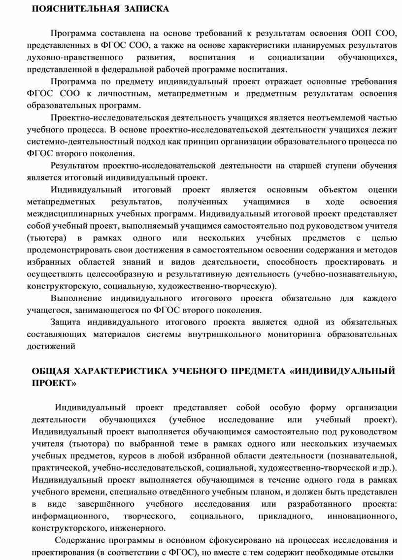 Программа по предмету индивидуальный проект отражает основные требования ФГОС СОО к личностным, метапредметным и предметным результатам освоения образовательных программ.