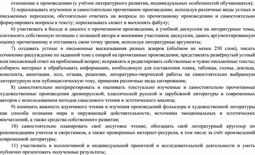 Основу содержания литературного образования составляют чтение и изучение выдающихся художественных произведений русской и мировой литературы, что способствует постижению таких нравственных категорий, как добро, справедливость, честь, патриотизм, гуманизм, дом, семья. Целостное восприятие и понимание художественного произведения, его анализ и интерпретация возможны лишь при соответствующей эмоционально-эстетической реакции читателя, которая зависит от возрастных особенностей школьников, их психического и литературного развития, жизненного и читательского опыта.