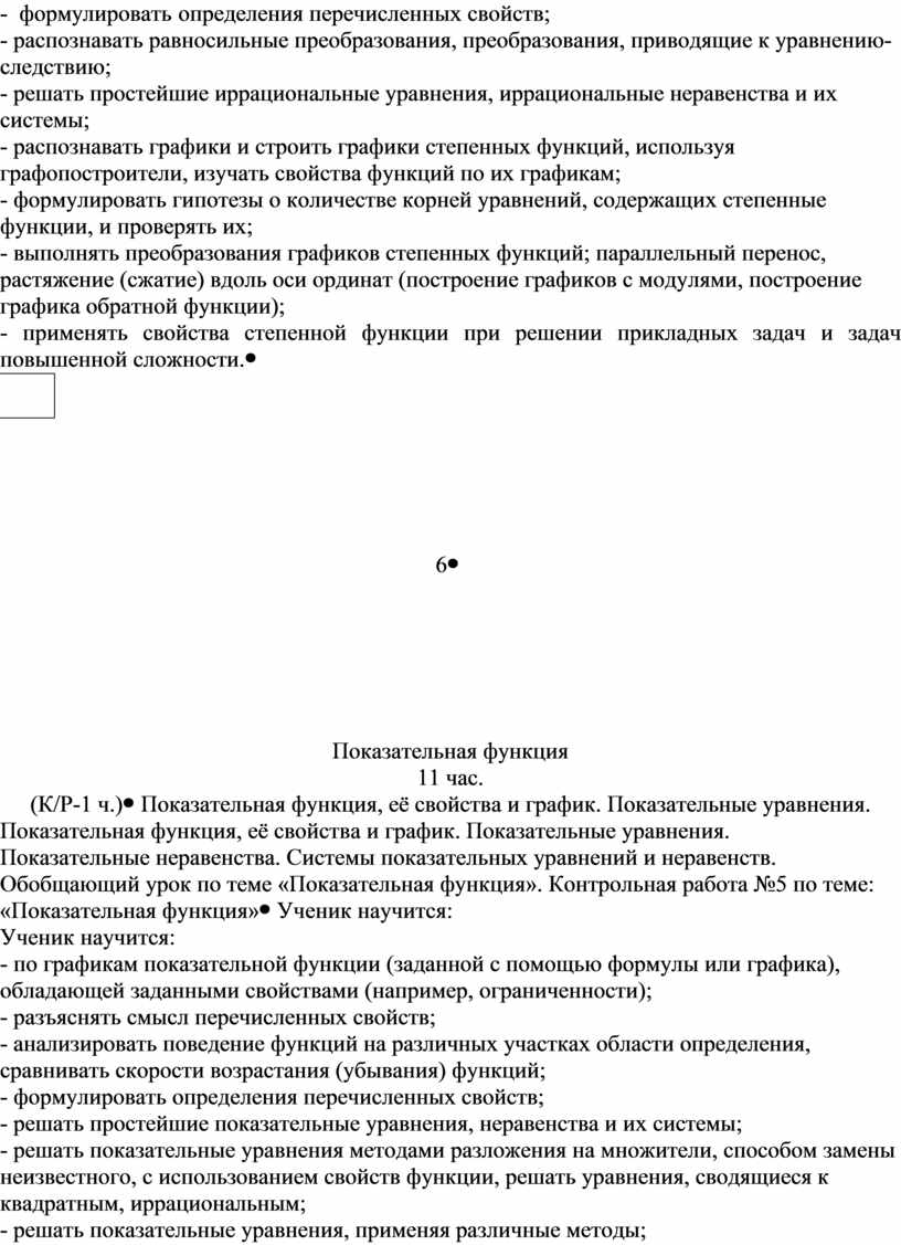 Показательная функция, её свойства и график. Показательные уравнения. Показательные неравенства. Системы показательных уравнений и неравенств. Обобщающий урок по теме «Показательная функция». Контрольная работа №5 по теме: «Показательная функция» |