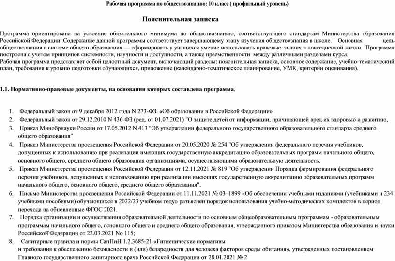 Рабочая программа по обществознанию: 10 класс ( профильный уровень)