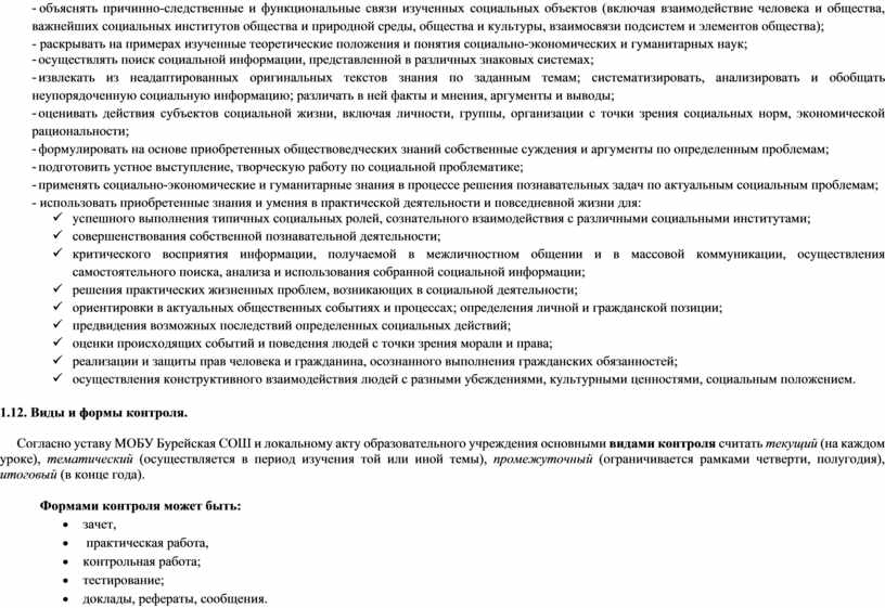 Согласно уставу МОБУ Бурейская СОШ и локальному акту образовательного учреждения основными видами контроля считать текущий (на каждом уроке), тематический (осуществляется в период изучения той или иной темы), промежуточный (ограничивается рамками четверти, полугодия), итоговый (в конце года).