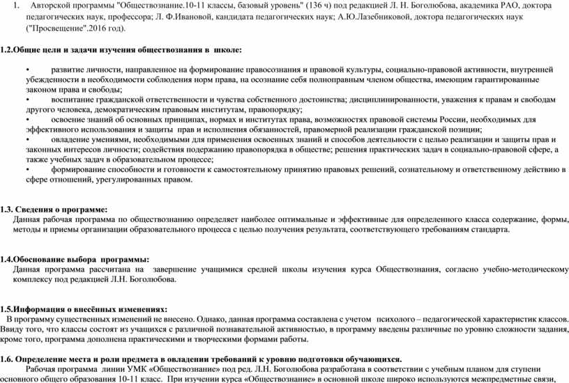 9. Авторской программы "Обществознание.10-11 классы, базовый уровень" (136 ч) под редакцией Л. Н. Боголюбова, академика РАО, доктора педагогических наук, профессора; Л. Ф.Ивановой, кандидата педагогических наук; А.Ю.Лазебниковой, доктора педагогических наук ("Просвещение".2016 год).
