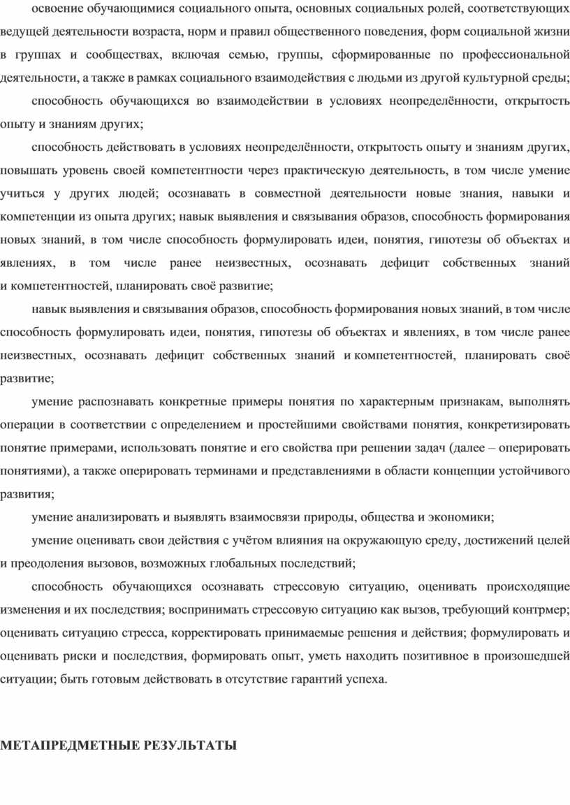 ориентация на применение знаний из социальных и естественных наук для решения задач в области окружающей среды, планирования поступков и оценка возможных последствий своих действий для окружающей среды; повышение уровня экологической культуры, осознание глобального характера экологических проблем и путей их решения; активное неприятие действий, приносящих вред окружающей среде; осознание своей роли как гражданина и потребителя в условиях взаимосвязи природной, технологической и социальной сред; готовность к участию в практической деятельности экологической направленности.