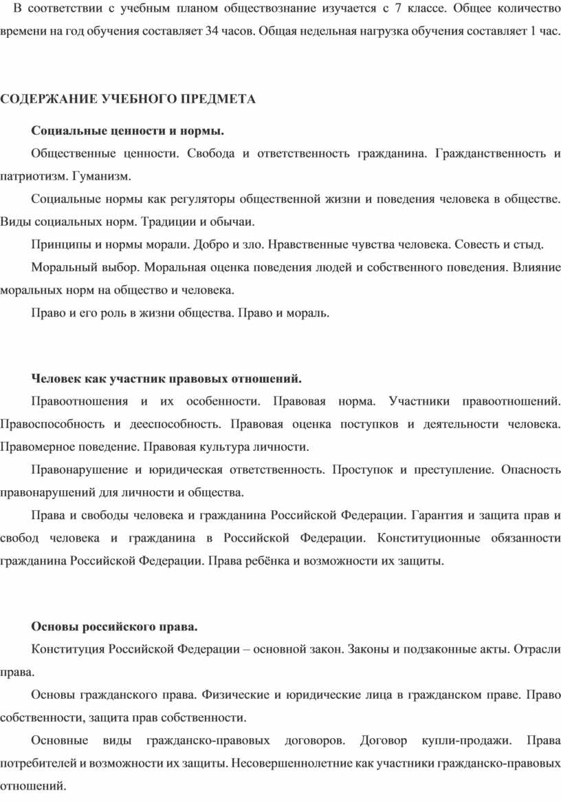В соответствии с учебным планом обществознание изучается с 7 классе. Общее количество времени на год обучения составляет 34 часов. Общая недельная нагрузка обучения составляет 1 час.