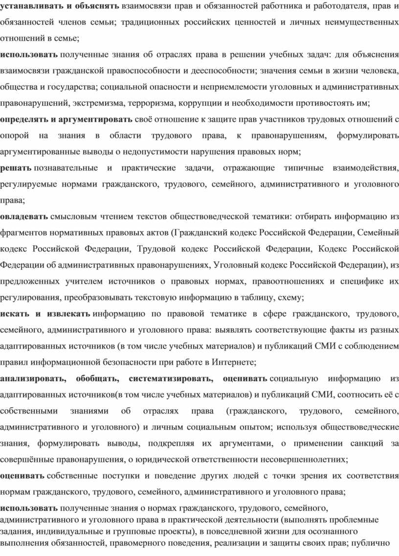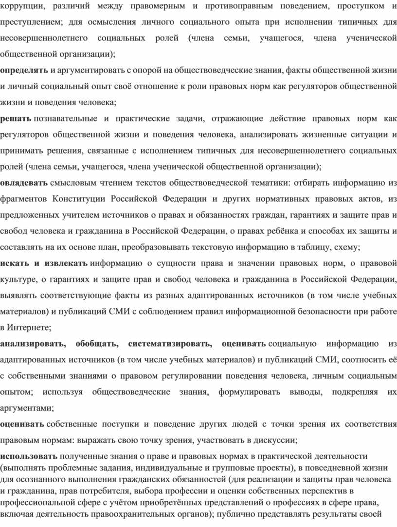 · формирование опыта применения полученных знаний и умений для выстраивания отношений между людьми различных национальностей и вероисповеданий в общегражданской и в семейно-бытовой сферах; для соотнесения своих действий и действий других людей с нравственными ценностями и нормами поведения, установленными законом; содействия правовыми способами и средствами защите правопорядка в обществе.