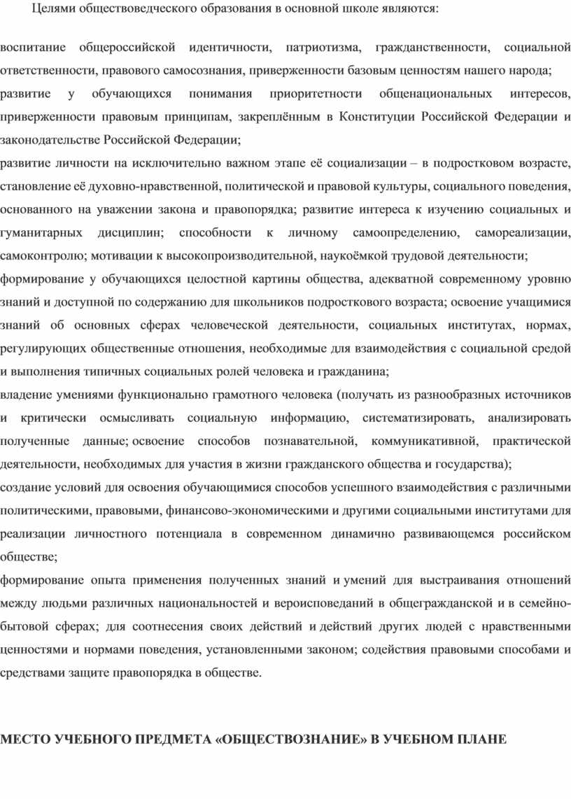 Изучение обществознания, включающего знания о российском обществе и направлениях его развития в современных условиях, об основах конституционного строя нашей страны, правах и обязанностях человека и гражданина, способствует воспитанию российской гражданской идентичности, готовности к служению Отечеству, приверженности национальным ценностям. Привлечение при изучении обществознания различных источников социальной информации помогает обучающимся освоить язык современной культурной, социально-экономической и политической коммуникации, вносит свой вклад в формирование метапредметных умений извлекать необходимые сведения, осмысливать, преобразовывать и применять их.