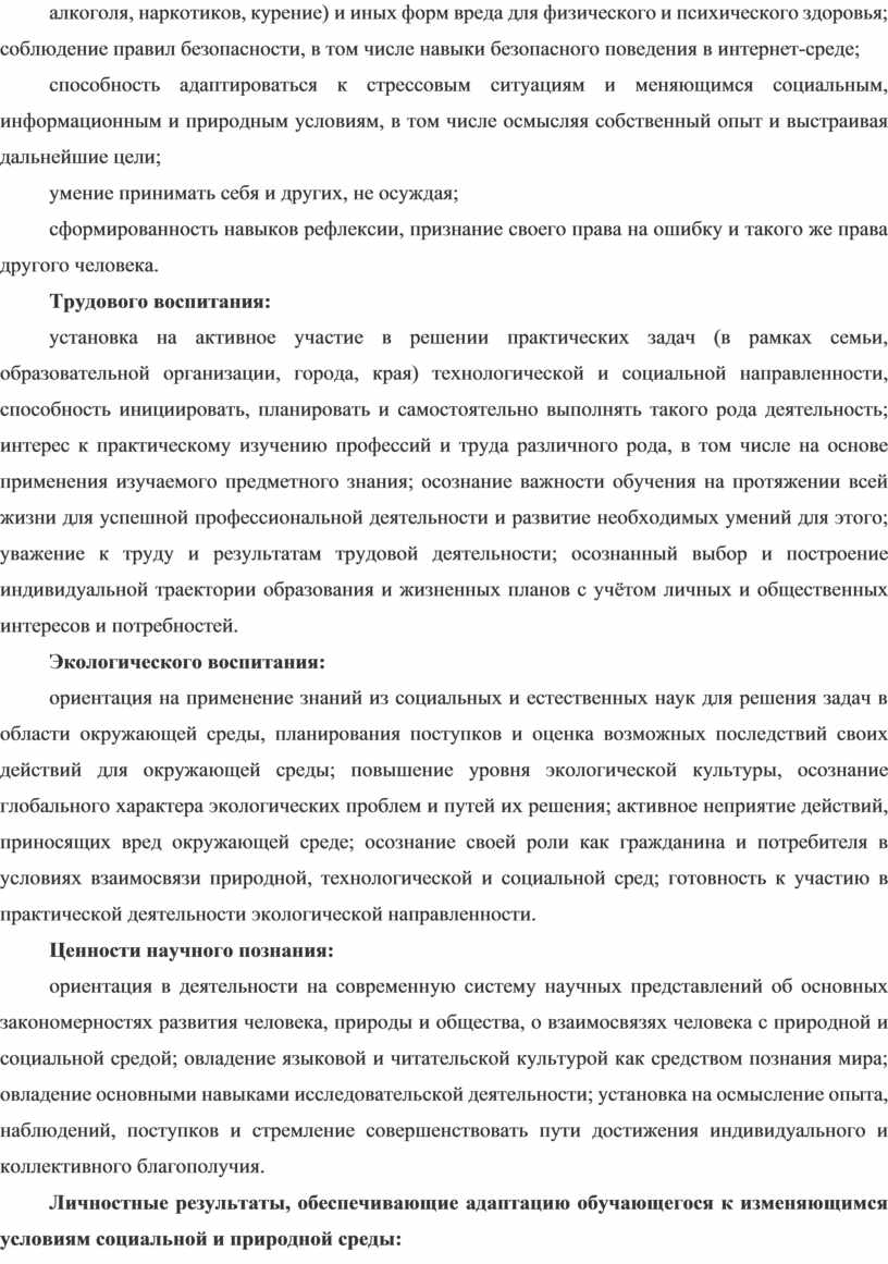 Личностные результаты, обеспечивающие адаптацию обучающегося к изменяющимся условиям социальной и природной среды: