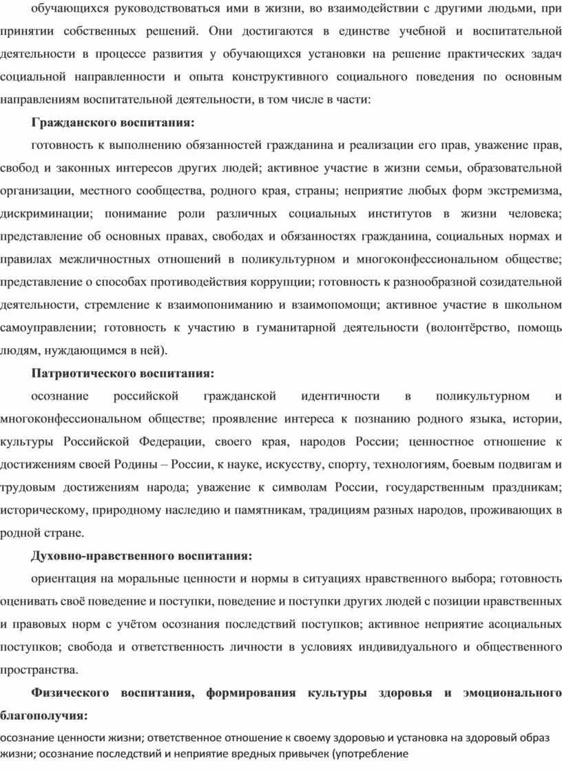 готовность к выполнению обязанностей гражданина и реализации его прав, уважение прав, свобод и законных интересов других людей; активное участие в жизни семьи, образовательной организации, местного сообщества, родного края, страны; неприятие любых форм экстремизма, дискриминации; понимание роли различных социальных институтов в жизни человека; представление об основных правах, свободах и обязанностях гражданина, социальных нормах и правилах межличностных отношений в поликультурном и многоконфессиональном обществе; представление о способах противодействия коррупции; готовность к разнообразной созидательной деятельности, стремление к взаимопониманию и взаимопомощи; активное участие в школьном самоуправлении; готовность к участию в гуманитарной деятельности (волонтёрство, помощь людям, нуждающимся в ней).