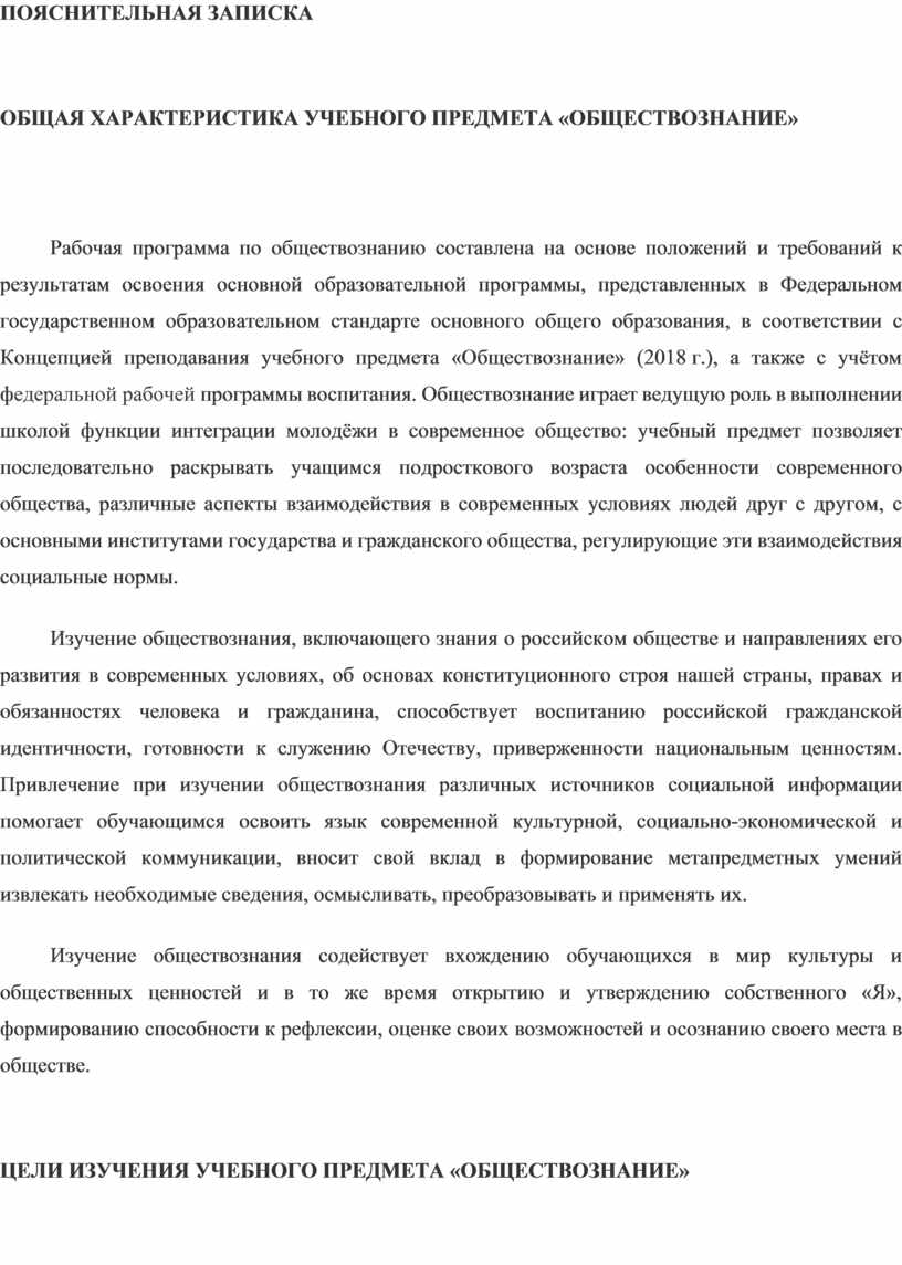 Рабочая программа по обществознанию составлена на основе положений и требований к результатам освоения основной образовательной программы, представленных в Федеральном государственном образовательном стандарте основного общего образования, в соответствии с Концепцией преподавания учебного предмета «Обществознание» (2018 г.), а также с учётом федеральной рабочей программы воспитания. Обществознание играет ведущую роль в выполнении школой функции интеграции молодёжи в современное общество: учебный предмет позволяет последовательно раскрывать учащимся подросткового возраста особенности современного общества, различные аспекты взаимодействия в современных условиях людей друг с другом, с основными институтами государства и гражданского общества, регулирующие эти взаимодействия социальные нормы.