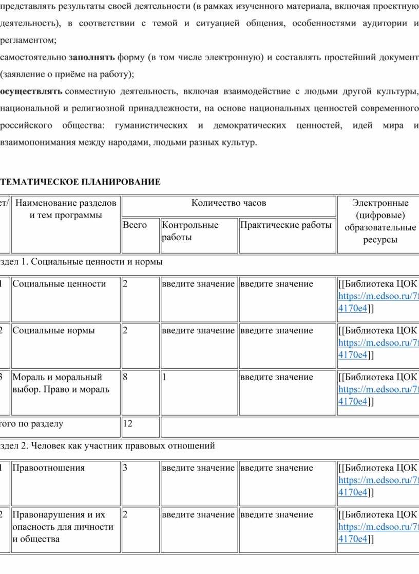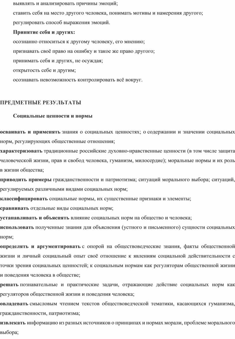 ориентация на моральные ценности и нормы в ситуациях нравственного выбора; готовность оценивать своё поведение и поступки, поведение и поступки других людей с позиции нравственных и правовых норм с учётом осознания последствий поступков; активное неприятие асоциальных поступков; свобода и ответственность личности в условиях индивидуального и общественного пространства.