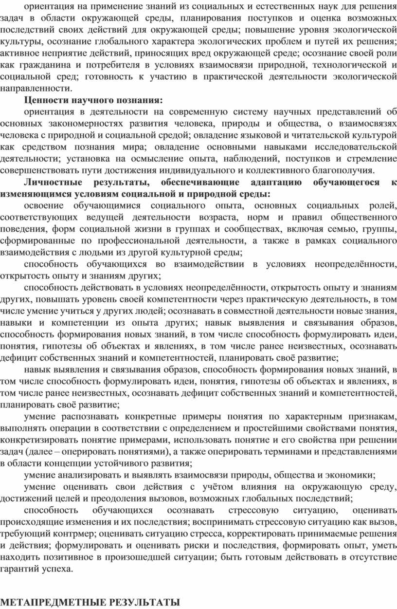 ориентация на применение знаний из социальных и естественных наук для решения задач в области окружающей среды, планирования поступков и оценка возможных последствий своих действий для окружающей среды; повышение уровня экологической культуры, осознание глобального характера экологических проблем и путей их решения; активное неприятие действий, приносящих вред окружающей среде; осознание своей роли как гражданина и потребителя в условиях взаимосвязи природной, технологической и социальной сред; готовность к участию в практической деятельности экологической направленности.