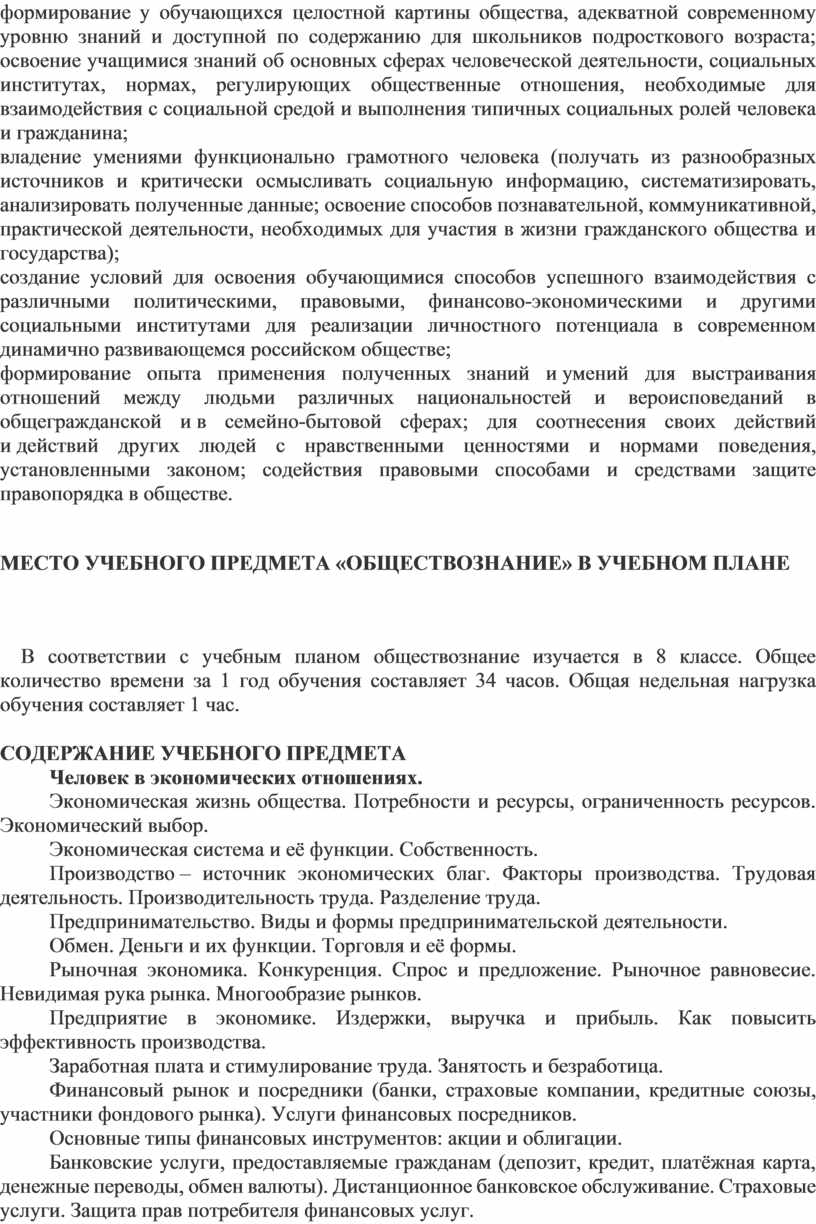 · формирование у обучающихся целостной картины общества, адекватной современному уровню знаний и доступной по содержанию для школьников подросткового возраста; освоение учащимися знаний об основных сферах человеческой деятельности, социальных институтах, нормах, регулирующих общественные отношения, необходимые для взаимодействия с социальной средой и выполнения типичных социальных ролей человека и гражданина;