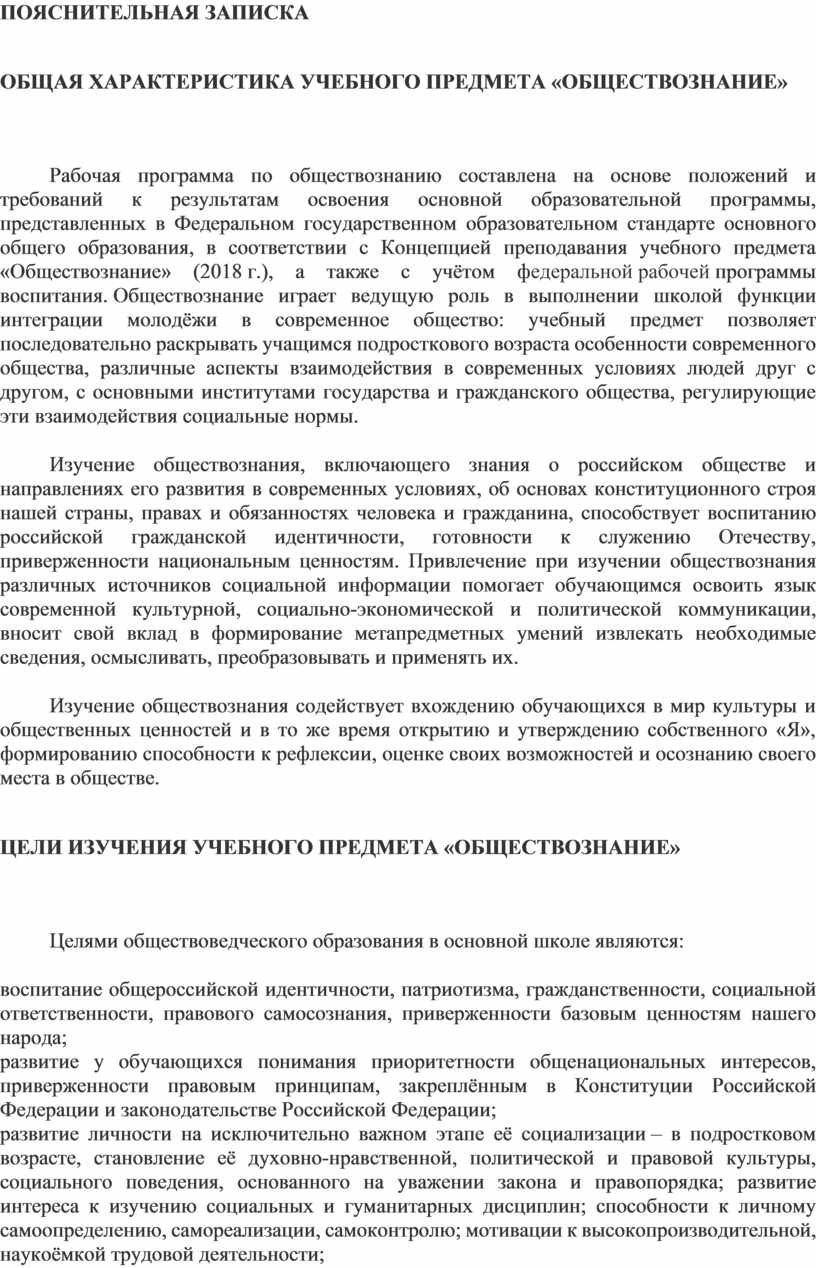 Рабочая программа по обществознанию составлена на основе положений и требований к результатам освоения основной образовательной программы, представленных в Федеральном государственном образовательном стандарте основного общего образования, в соответствии с Концепцией преподавания учебного предмета «Обществознание» (2018 г.), а также с учётом федеральной рабочей программы воспитания. Обществознание играет ведущую роль в выполнении школой функции интеграции молодёжи в современное общество: учебный предмет позволяет последовательно раскрывать учащимся подросткового возраста особенности современного общества, различные аспекты взаимодействия в современных условиях людей друг с другом, с основными институтами государства и гражданского общества, регулирующие эти взаимодействия социальные нормы.