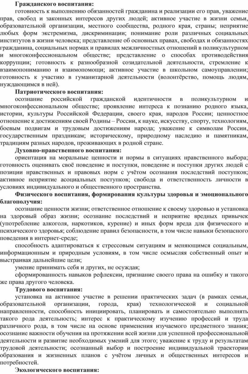 готовность к выполнению обязанностей гражданина и реализации его прав, уважение прав, свобод и законных интересов других людей; активное участие в жизни семьи, образовательной организации, местного сообщества, родного края, страны; неприятие любых форм экстремизма, дискриминации; понимание роли различных социальных институтов в жизни человека; представление об основных правах, свободах и обязанностях гражданина, социальных нормах и правилах межличностных отношений в поликультурном и многоконфессиональном обществе; представление о способах противодействия коррупции; готовность к разнообразной созидательной деятельности, стремление к взаимопониманию и взаимопомощи; активное участие в школьном самоуправлении; готовность к участию в гуманитарной деятельности (волонтёрство, помощь людям, нуждающимся в ней).