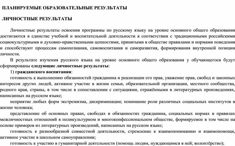 Планируемые результаты освоения программы по русскому языку включают личностные, метапредметные результаты за весь период обучения на уровне основного общего образования, а также предметные достижения обучающегося за каждый год обучения.