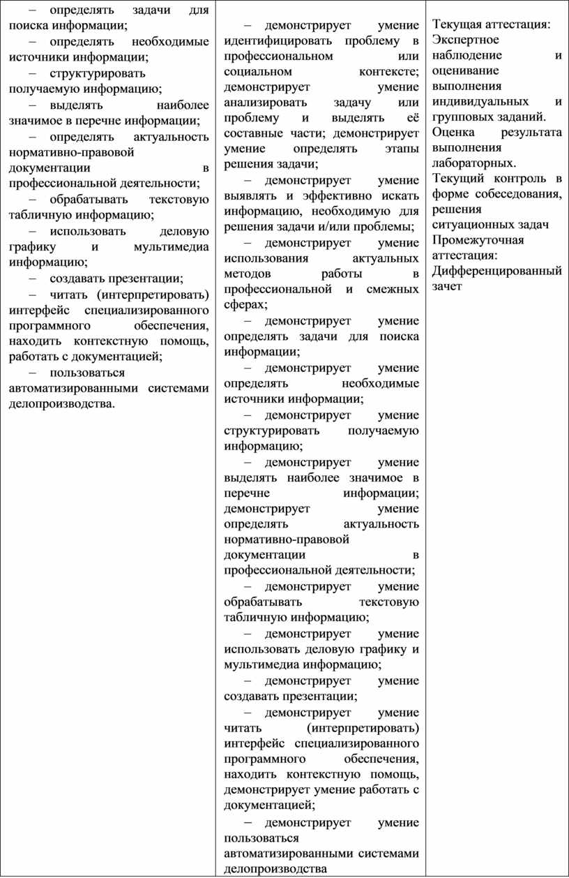 - демонстрирует умение идентифицировать проблему в профессиональном или социальном контексте; демонстрирует умение анализировать задачу или проблему и выделять её составные части; демонстрирует умение определять этапы решения задачи; - демонстрирует умение выявлять и эффективно искать информацию, необходимую для решения задачи и/или проблемы; - демонстрирует умение использования актуальных методов работы в профессиональной и смежных сферах; - демонстрирует умение определять задачи для поиска информации; - демонстрирует умение определять необходимые источники информации; - демонстрирует умение структурировать получаемую информацию; - демонстрирует умение выделять наиболее значимое в перечне информации; демонстрирует умение определять актуальность нормативно-правовой документации в профессиональной деятельности; - демонстрирует умение обрабатывать текстовую табличную информацию; - демонстрирует умение использовать деловую графику и мультимедиа информацию; - демонстрирует умение создавать презентации; - демонстрирует умение читать (интерпретировать) интерфейс специализированного программного обеспечения, находить контекстную помощь, демонстрирует умение работать с документацией; - демонстрирует умение пользоваться автоматизированными системами делопроизводства |