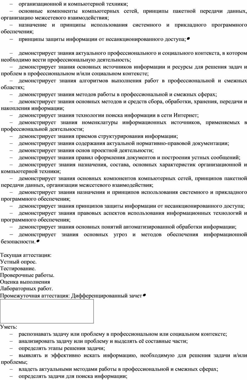 Знать: - актуальный профессиональный и социальный контекст, в котором необходимо вести профессиональную деятельность; - основные источники информации и ресурсы для решения задач и проблем в профессиональном и/или социальном контексте; - алгоритмы выполнения работ в профессиональной и смежных областях; - методы работы в профессиональной и смежных сферах; - основные методы и средства сбора, обработки, хранения, передачи и накопления информации; - технологию поиска информации в сети Интернет; - номенклатуру информационных источников, применяемых в профессиональной деятельности; приемы структурирования информации; - содержание актуальной нормативно-правовой документации; - основы проектной деятельности; - правила оформления документов и построения устных сообщений; - назначение, состав, основные характеристики организационной и компьютерной техники; - основные компоненты компьютерных сетей, принципы пакетной передачи данных, организацию межсетевого взаимодействия; - назначение и принципы использования системного и прикладного программного обеспечения; - принципы защиты информации от несанкционированного доступа; |