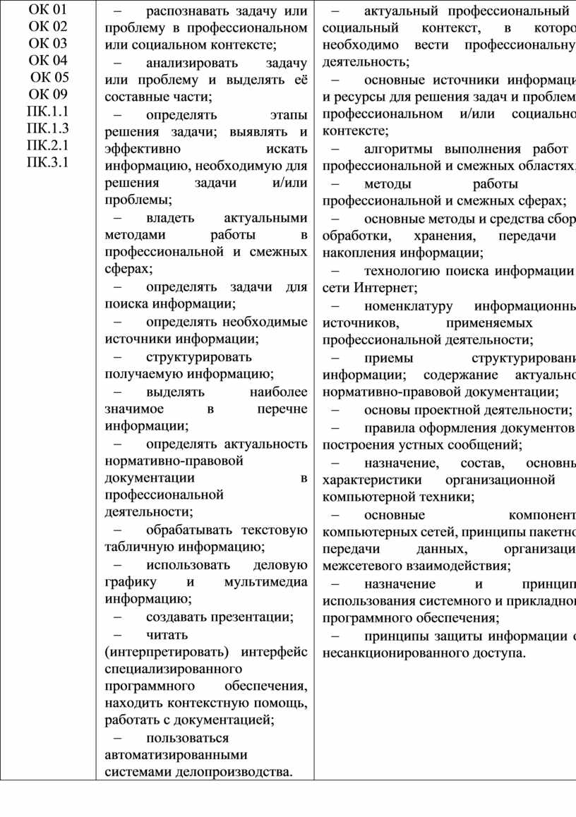 ОК 01 ОК 02 ОК 03 ОК 04 ОК 05 ОК 09 ПК.1.3 ПК.2.1 ПК.3.1