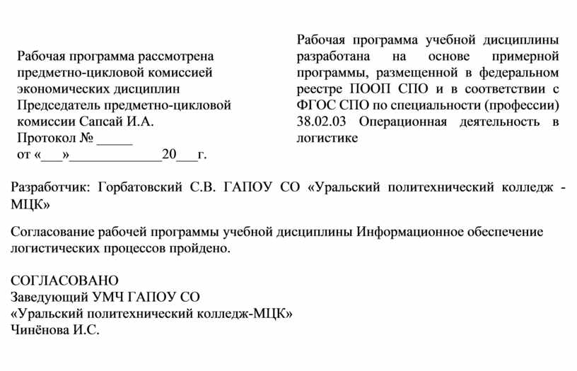 Рабочая программа учебной дисциплины разработана на основе примерной программы, размещенной в федеральном реестре ПООП СПО и в соответствии с ФГОС СПО по специальности (профессии) 38.02.03 Операционная деятельность в логистике |
