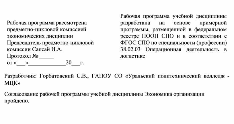 Рабочая программа учебной дисциплины разработана на основе примерной программы, размещенной в федеральном реестре ПООП СПО и в соответствии с ФГОС СПО по специальности (профессии) 38.02.03 Операционная деятельность в логистике |