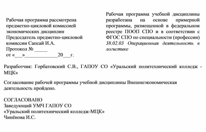 Рабочая программа учебной дисциплины разработана на основе примерной программы, размещенной в федеральном реестре ПООП СПО и в соответствии с ФГОС СПО по специальности (профессии) 38.02.03 Операционная деятельность в логистике |