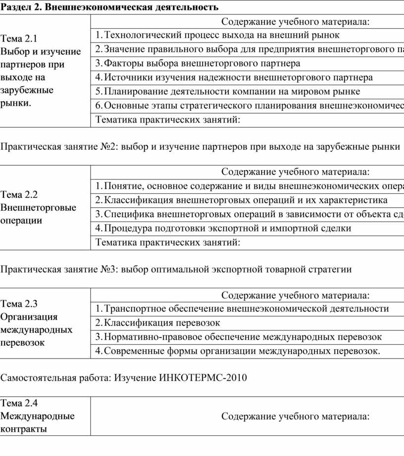 - виды деятельности организации на международных рынках; - способы выхода на зарубежные рынки и организации внешнеторговых операций; - договорно-правовой механизм внешнеэкономической деятельности; - таможенное обеспечение внешнеторговых операций. |