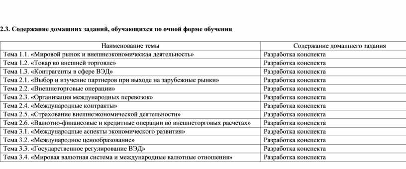2.3. Содержание домашних заданий, обучающихся по очной форме обучения