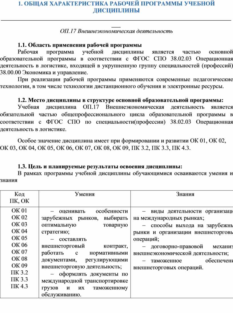 Учебная дисциплина ОП.17 Внешнеэкономическая деятельность является обязательной частью общепрофессионального цикла образовательной программы в соответствии с ФГОС СПО по специальности(профессии) 38.02.03 Операционная деятельность в логистике.