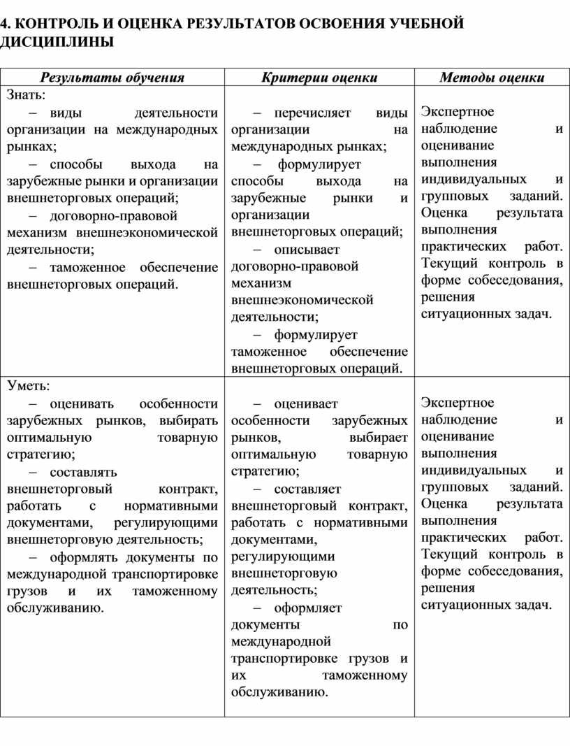 Уметь: - оценивать особенности зарубежных рынков, выбирать оптимальную товарную стратегию; - составлять внешнеторговый контракт, работать с нормативными документами, регулирующими внешнеторговую деятельность; - оформлять документы по международной транспортировке грузов и их таможенному обслуживанию. |