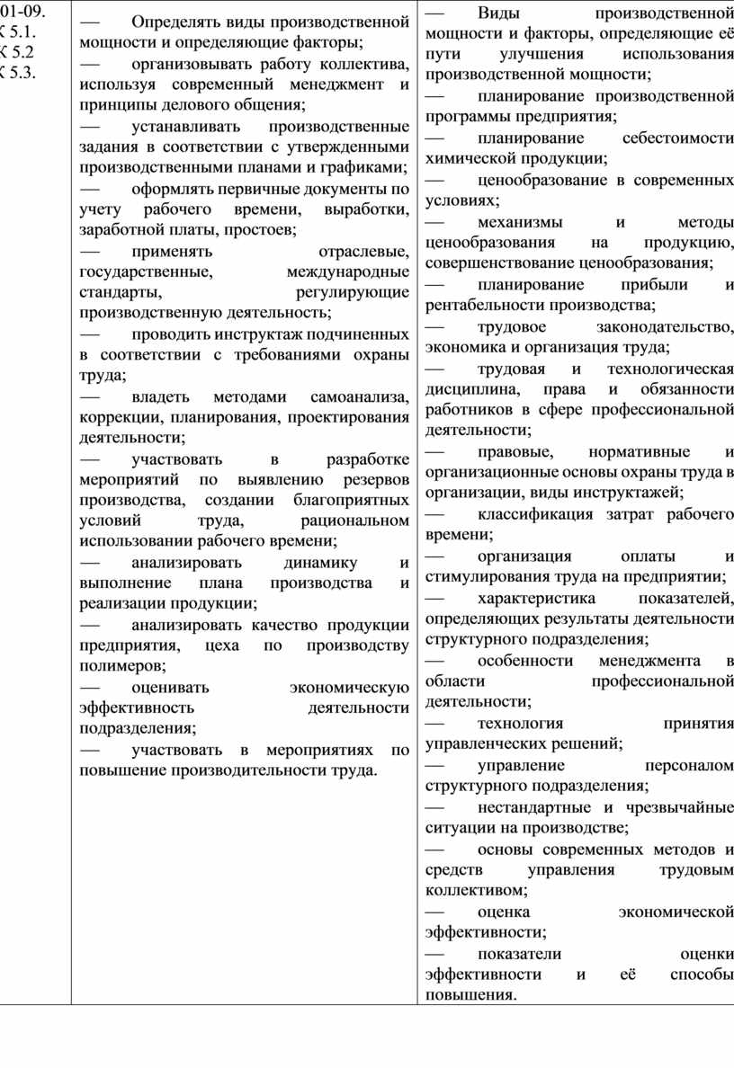 Уметь: - Определять виды производственной мощности и определяющие факторы; - организовывать работу коллектива, используя современный менеджмент и принципы делового общения; - устанавливать производственные задания в соответствии с утвержденными производственными планами и графиками; - оформлять первичные документы по учету рабочего времени, выработки, заработной платы, простоев; - применять отраслевые, государственные, международные стандарты, регулирующие производственную деятельность; - проводить инструктаж подчиненных в соответствии с требованиями охраны труда; - владеть методами самоанализа, коррекции, планирования, проектирования деятельности; - участвовать в разработке мероприятий по выявлению резервов производства, создании благоприятных условий труда, рациональном использовании рабочего времени; - анализировать динамику и выполнение плана производства и реализации продукции; - анализировать качество продукции предприятия, цеха по производству полимеров; - оценивать экономическую эффективность деятельности подразделения; - участвовать в мероприятиях по повышение производительности труда. |