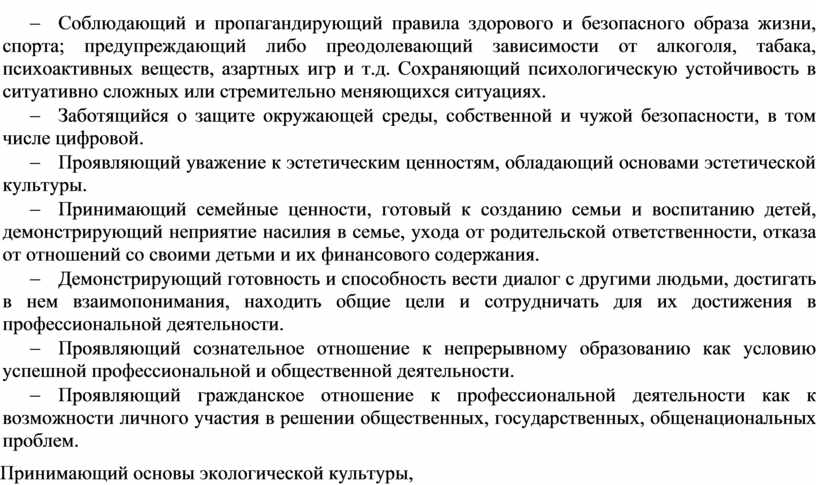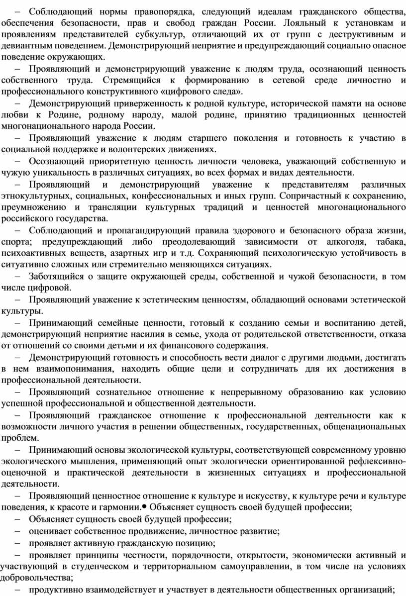 Личные результаты: - Осознающий себя гражданином и защитником великой страны. - Проявляющий активную гражданскую позицию, демонстрирующий приверженность принципам честности, порядочности, открытости, экономически активный и участвующий в студенческом и территориальном самоуправлении, в том числе на условиях добровольчества, продуктивно взаимодействующий и участвующий в деятельности общественных организаций. - Соблюдающий нормы правопорядка, следующий идеалам гражданского общества, обеспечения безопасности, прав и свобод граждан России. Лояльный к установкам и проявлениям представителей субкультур, отличающий их от групп с деструктивным и девиантным поведением. Демонстрирующий неприятие и предупреждающий социально опасное поведение окружающих. - Проявляющий и демонстрирующий уважение к людям труда, осознающий ценность собственного труда. Стремящийся к формированию в сетевой среде личностно и профессионального конструктивного «цифрового следа». - Демонстрирующий приверженность к родной культуре, исторической памяти на основе любви к Родине, родному народу, малой родине, принятию традиционных ценностей многонационального народа России. - Проявляющий уважение к людям старшего поколения и готовность к участию в социальной поддержке и волонтерских движениях. - Осознающий приоритетную ценность личности человека, уважающий собственную и чужую уникальность в различных ситуациях, во всех формах и видах деятельности. - Проявляющий и демонстрирующий уважение к представителям различных этнокультурных, социальных, конфессиональных и иных групп. Сопричастный к сохранению, преумножению и трансляции культурных традиций и ценностей многонационального российского государства. - Соблюдающий и пропагандирующий правила здорового и безопасного образа жизни, спорта; предупреждающий либо преодолевающий зависимости от алкоголя, табака, психоактивных веществ, азартных игр и т.д. Сохраняющий психологическую устойчивость в ситуативно сложных или стремительно меняющихся ситуациях. - Заботящийся о защите окружающей среды, собственной и чужой безопасности, в том числе цифровой. - Проявляющий уважение к эстетическим ценностям, обладающий основами эстетической культуры. - Принимающий семейные ценности, готовый к созданию семьи и воспитанию детей, демонстрирующий неприятие насилия в семье, ухода от родительской ответственности, отказа от отношений со своими детьми и их финансового содержания. - Демонстрирующий готовность и способность вести диалог с другими людьми, достигать в нем взаимопонимания, находить общие цели и сотрудничать для их достижения в профессиональной деятельности. - Проявляющий сознательное отношение к непрерывному образованию как условию успешной профессиональной и общественной деятельности. - Проявляющий гражданское отношение к профессиональной деятельности как к возможности личного участия в решении общественных, государственных, общенациональных проблем. - Принимающий основы экологической культуры, соответствующей современному уровню экологического мышления, применяющий опыт экологически ориентированной рефлексивно-оценочной и практической деятельности в жизненных ситуациях и профессиональной деятельности. - Проявляющий ценностное отношение к культуре и искусству, к культуре речи и